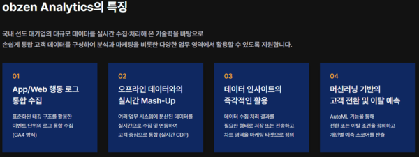 회사의 '고객 분석 강화' 전략은 '오브젠 애널리틱스(obzen Analytics)' 솔루션이 핵심이다. 기업은 홈페이지와 모바일 앱에서 수집한 이용자 행동 데이터를 분석해 마케팅에 활용하고자 한다. 이용자가 어느 메뉴에서 오랫동안 머물렀는지, 어떤 화면을 거친 이용자가 가장 많이 이탈했는지 등의 데이터를 확보할 수 있다면 맞춤형 마케팅을 할 수 있기 때문이다. 이러한 고객의 여정을 실시간으로 파악하고 싶어하는 기업의 수요도 늘고 있다. 이용자 행동에 맞춰 실시간으로 상품을 추천하거나 쿠폰을 제공하면 구매 전환율을 높일 수 있다. 기업은 이러한 맞춤형 마케팅을 할 수 있다면 새로운 고객을 확보할 수 있는 확률을 높이면서 비용도 줄일 수 있다. 이는 불특정 다수가 아닌 타깃 이용자에게만 맞춤형 마케팅을 제공할 수 있기 때문이다.