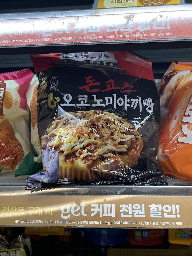 CU의 돈코츠 오코노미야끼빵은 일본식 오코노미야끼의 풍미를 재현한 한정판 빵으로, 가쓰오부시, 베이컨, 양배추 토핑과 특제 돈코츠 소스 조합이 좋아요.