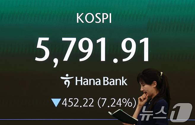 (서울=뉴스1) 김도우 기자 = 미국과 이란 전쟁 여파로 국내 증시가 급락한 3일 서울 중구 하나은행 본점 딜링룸 전광판에 종가가 표시되고 있다.
