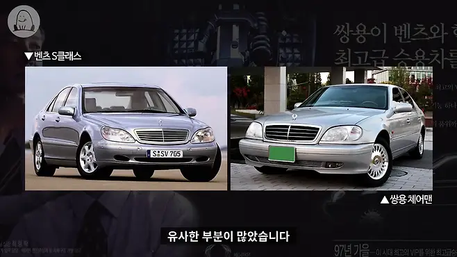 아시아 변방, 한국의 국소 메이커인 쌍용을 얕잡아 봤던 벤츠는 예상치 못한 높은 완성도에 판매 간섭을 우려했고, 미국과 유럽 선진국 등에 체어맨을 수출하지 못하게 막는 것으로 견제했어요. 쌍용 역시 내수 시장에 초점을 맞췄기 때문에 큰 타격은 없었습니다. 이윽고 1997년, '체어맨'이라는 이름표를 단 대형 세단이 혜성처럼 등장했죠.