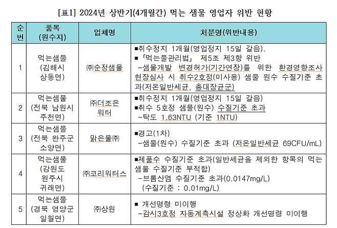 환경부가 공개한 먹는 샘물 영업자 위반 현황 자료 중 2024년 상반기 생수 제조사의 적발 내용과 적발 업체들의 자사 및 OEM 브랜드를 공개한다.