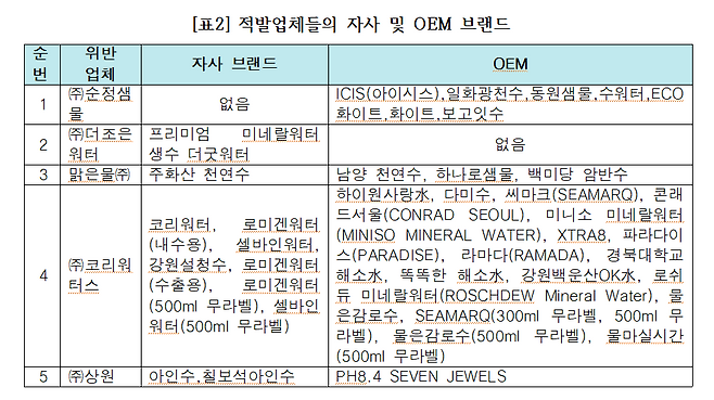 더 큰 문제는 적발업체들이 생산하는 생수가 자사 및 OEM 브랜드로 생산되어 유통되고 있다는 사실이다.