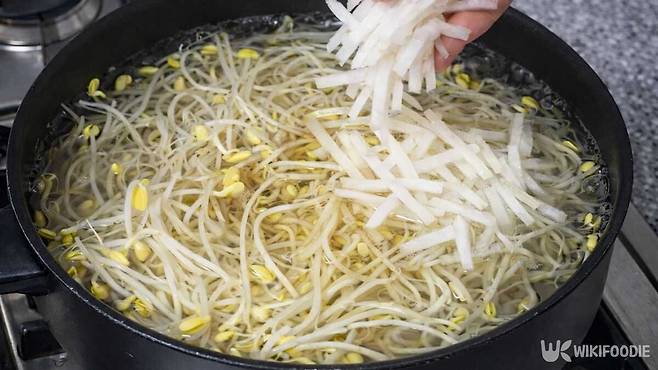 국물 맛을 또렷하게 만들고 싶다면 무를 함께 넣는다. 무는 결 방향을 따라 세로로 채 썬다. 결대로 썰어야 익은 뒤에도 쉽게 부서지지 않는다. 콩나물 굵기와 비슷하게 가늘게 썰면 식감이 자연스럽게 어우러진다. 무에서 나오는 은은한 단맛이 국물에 스며들어 시원함을 더한다.
