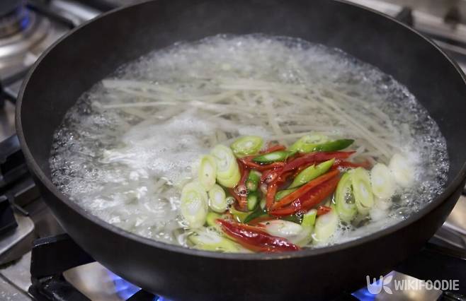 4. 끓는 물에 콩나물 300g을 넣고, 필요하면 끓는 물을 소량 더해 온도를 유지한다. 뚜껑은 열어둔 채 5분 끓인다.