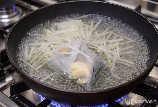 7. 다시팩을 건지고 채 썬 무를 넣어 한 번 더 끓인다.