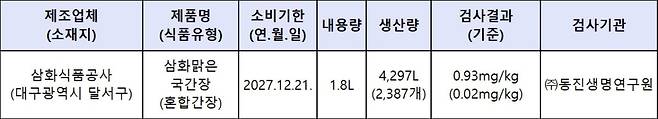기준치 46배 초과… ‘삼화맑은국간장’ 전량 회수 조치