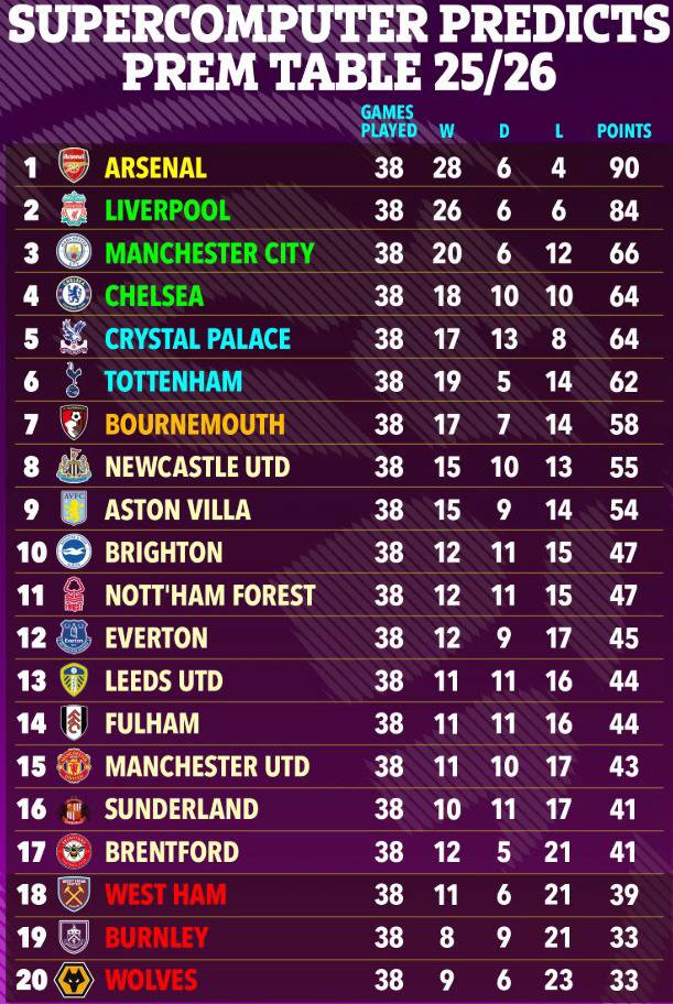 토트넘의 부진은 슈퍼컴퓨터의 예측에도 반영되었습니다. '더선'이 공개한 2025-26시즌 잉글랜드 프리미어리그(EPL) 6라운드 후 예상 순위에 따르면, 토트넘은 4위(승점 11)로 떨어졌고, 최종 순위 예측에서는 6위로 밀려나 '빅4'에서 탈락할 것으로 전망되었습니다. 슈퍼컴퓨터는 아스널의 22년 만의 EPL 우승(승점 90점)을 점쳤고, 리버풀(승점 84)이 2위를 차지할 것으로 예상했습니다. 맨체스터 시티는 3위, 첼시는 4위, 크리스털 팰리스가 5위에 위치했습니다.