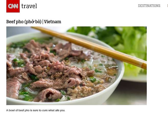 지난 2월에는 ‘세계 최고의 스프’ 목록에 나이지리아 ‘방가(Banga)’에 이어 두 번째로 베트남 ‘비프포(Beef pho, 소고기 쌀국수)’를 소개한 바 있다. CNN은 “베트남 쌀국수는 진한 국물을 만들기 위해 오랜 시간 동안 끓여진다”고 설명하면서 “베트남인이 사랑하고, 세계인들이 인정하는 베트남 요리 수출품 가운데 ‘쌀국수, 포’가 있다”고 안드레아 응우옌(미국계 베트남인) 요리사 말을 인용했다.