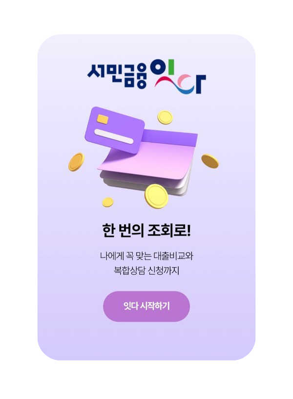 민간·정책서민금융상품 조회부터 대출까지 한번에 지원하는 ‘서민금융 잇다’가 운영을 시작했어요! 자세한 내용은 정책주간지 'K-공감'에서 확인하세요.