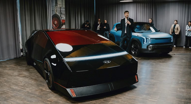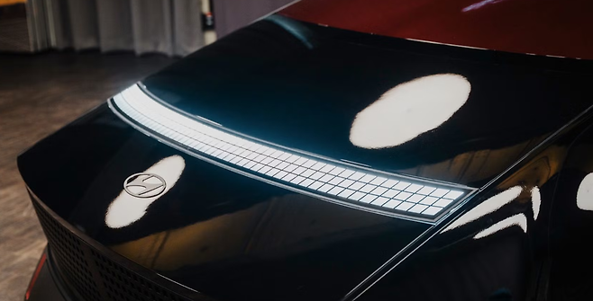 현대 오브시디안은 일견 테슬라 사이버트럭을 연상시키는 날카로운 각도와 투박하면서도 미래적인 실루엣으로 시선을 끈다. 픽셀형 LED 라이트가 전면부를 일렬로 수놓고, 유리 지붕과 완만한 루프라인은 마치 공상과학 영화 속 차량처럼 보인다. 이러한 외형은 현대의 기존 전기차 디자인에서 한층 진화한 형태로 평가된다.