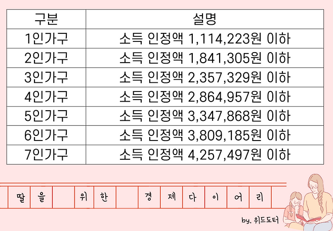 가구 구성원 특성: 65세 이상 노인, 만 15세 미만 영유아, 15세~24세 청소년으로 구성된 가구는 소득 인정액 외에도 나이에 따라 차상위계층 선정에 유리하게 작용될 수 있습니다.