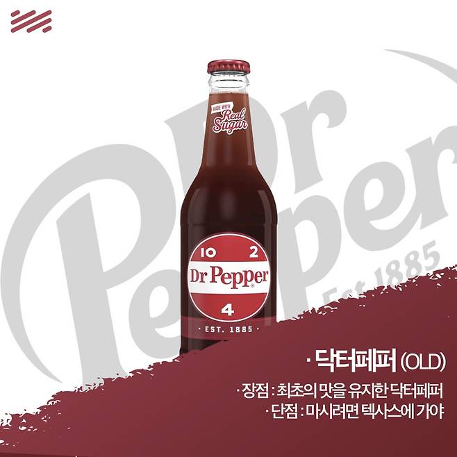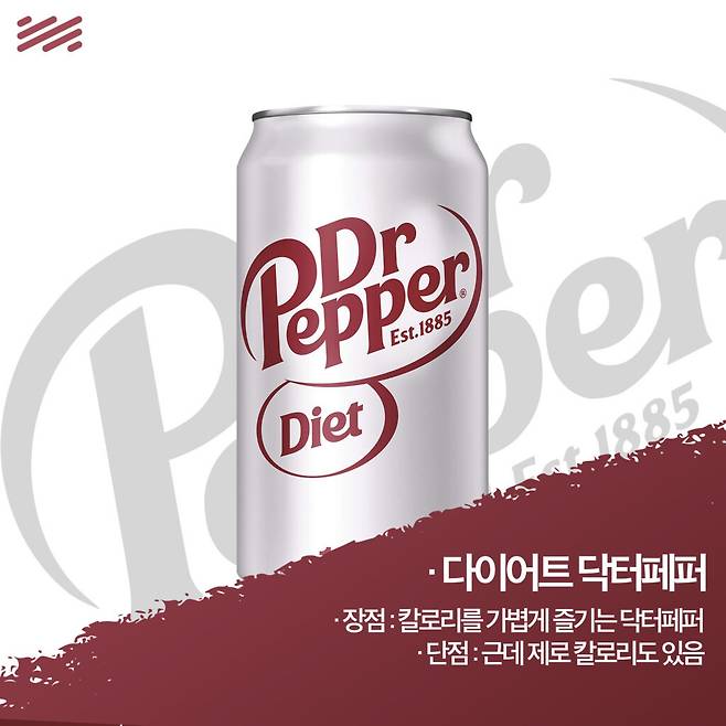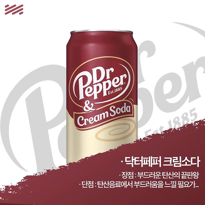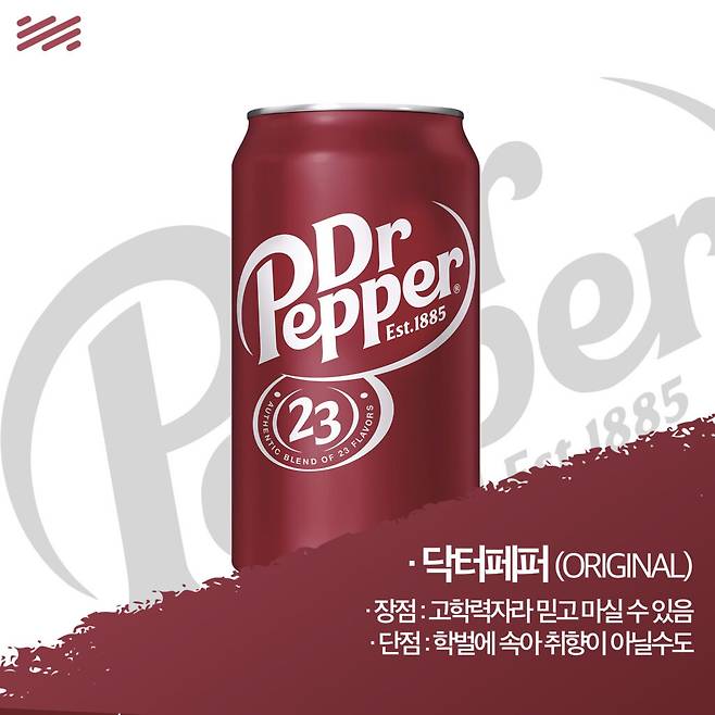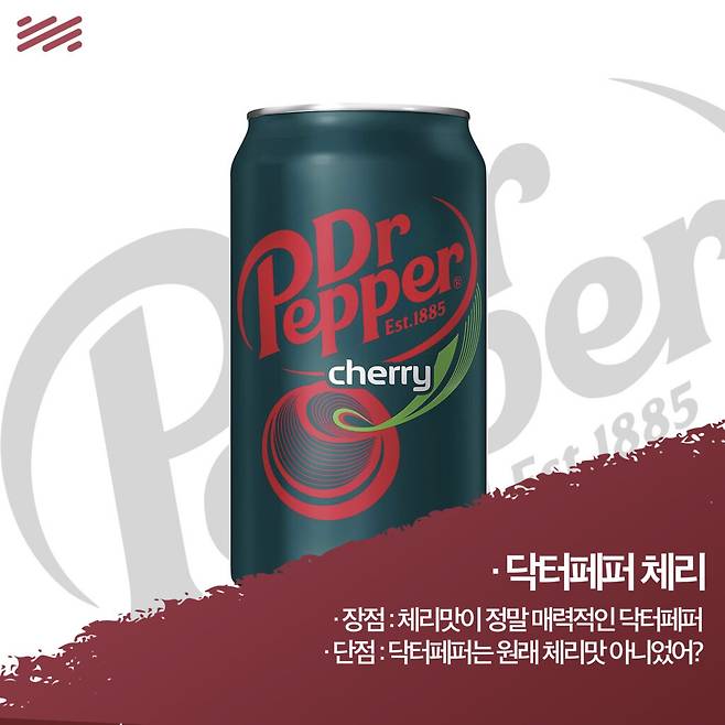 그중 하나가 ‘닥터페퍼는 체리맛 아니야?’다. 닥터페퍼는 체리를 포함한 23가지 재료의 향이 섞인 복합적인 음료니까. 그걸 의식하듯 나온 것이 각을 잡고 나온 체리맛 ‘닥터페퍼 체리’다.