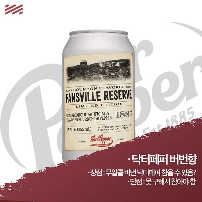 미국 대학풋볼리그 플레이오프를 맞이하여 나왔던 ‘버번위스키’향의 닥터페퍼다. 가뜩이나 미식가들의 음료로 소문난 닥터페퍼에서 위스키 향을 느낄 수 있다는 소식에 기대감을 가득 가졌던 닥터페퍼다.