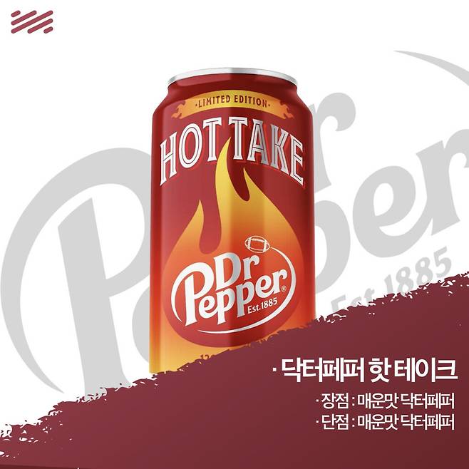 지난해가 버번향이었다면 올해는 ‘매운맛 닥터페퍼’가 나왔다. 닥터페퍼 핫 테이크다. 마찬가지로 미국대학풋볼리그 플레이오프 때 한정출시되었으며, 미션을 해결해야 받을 수 있는 제품이었다. 생긴 것은 HOT6이지만, 매운맛이 느껴지는 닥터페퍼라니 참을 수 없잖아!