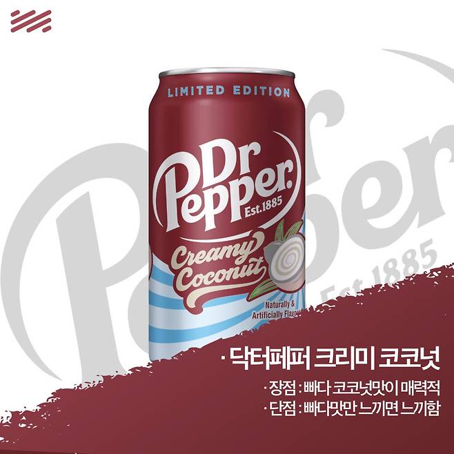 2024년 여름을 겨냥하고 나온 닥터페퍼의 빠다코코넛 버전이다. ‘닥터페퍼 크리미 코코넛’은 닥터페퍼에 부드럽고 달콤한 코코넛의 향미를 더했다. 그 임팩트가 굉장히 강해서 일반 닥터페퍼를 마실 때 심심하게 느껴질 정도다.