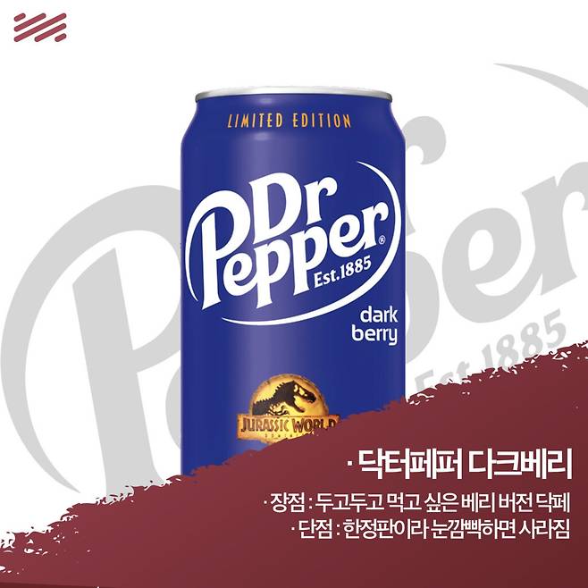 문제가 있다면 한정판이라는 것. 더 문제가 있다면 주로 출시되는 시기가 영화와 맞물린다는 점이다. 스파이더맨, 쥬라기 공원… 이 녀석들의 속편은 나와야 닥터페퍼 다크베리가 나올 텐데.