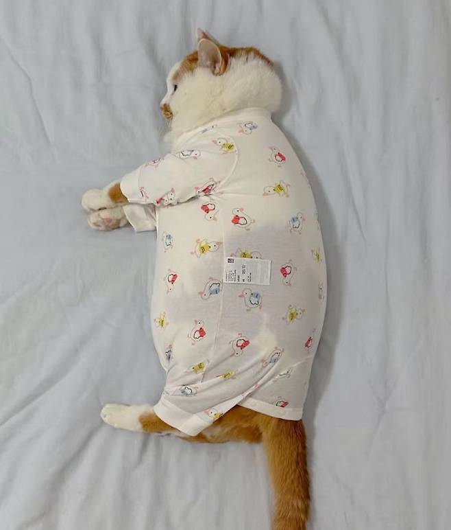 이제 우리 고양이의 새로운 직업은 '재활용 아기 옷 패션 모델'이 되었습니다. 덕분에 저희는 매일 아침 웃음 가득한 '패션쇼'를 관람하고 있답니다.