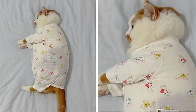 잠시 후, 옷을 입은 고양이가 눈을 게슴츠레 뜨고 기지개를 켜는 순간, 집사에게서 짧은 탄성이 터져 나왔습니다.