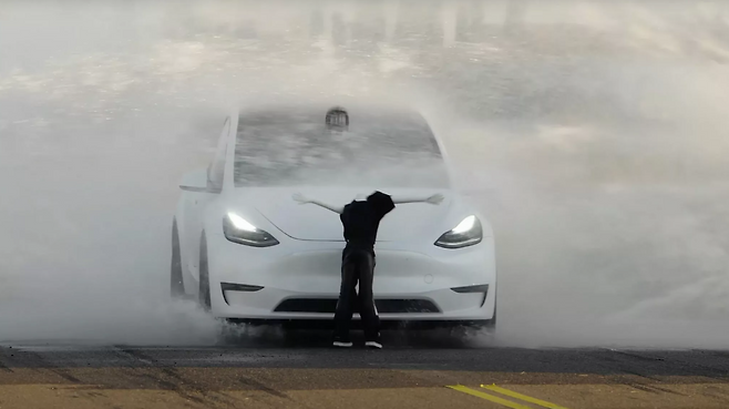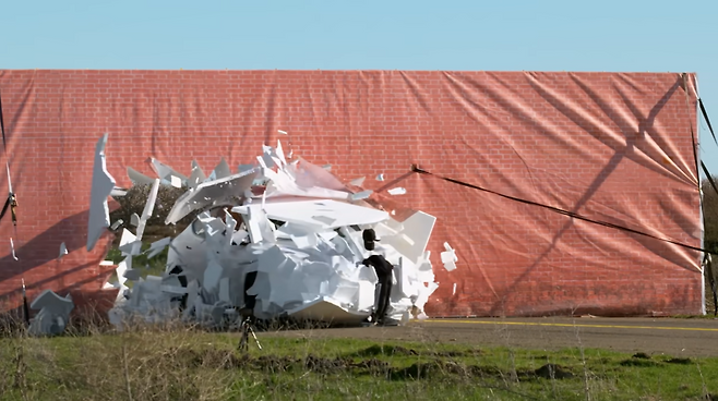 라이다 센서를 장착한 렉서스 RX는 실제 벽이 아니라는 점을 인식하고 멈춰 섰다. 그러나 테슬라 모델 Y는 벽 뒤에 있던 더미를 보호하기는커녕, 마치 저예산 TV 쇼의 스턴트 장면처럼 폼 블록 벽을 그대로 돌파해 버렸다.