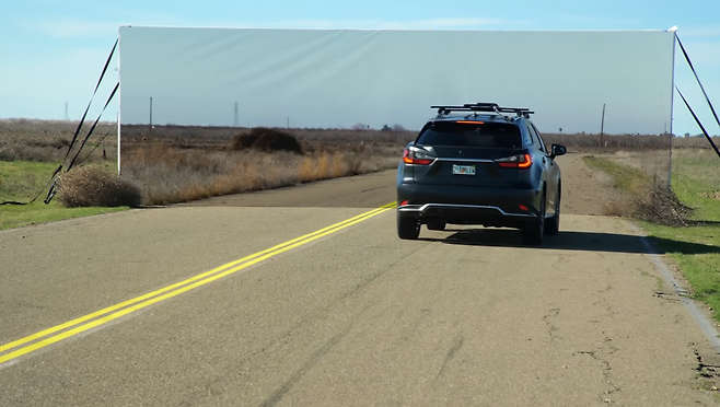 마지막 실험은 실생활에서 마주칠 가능성이 적은, 다소 극적인 시나리오를 가정했다. 실험팀은 실제 배경과 똑같이 그려진 거대한 폼 블록 벽을 설치해 두 차량이 이를 어떻게 인식하는지를 테스트했다. 마치 할리우드 영화에서 CGI가 도입되기 이전 시절 사용되던 배경 세트처럼 꾸민 것이다.