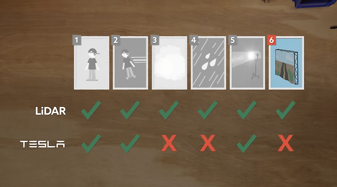유튜버 마크 로버(Mark Rober)는 자신이 소유한 테슬라 모델 Y와 라이다(LiDAR) 센서를 장착한 렉서스 RX를 비교하는 일련의 실험을 진행했다. 최종 실험에서는 두 차량이 극장 무대 배경처럼 꾸민 가짜 도로를 향해 돌진하는 방식으로 진행됐다.