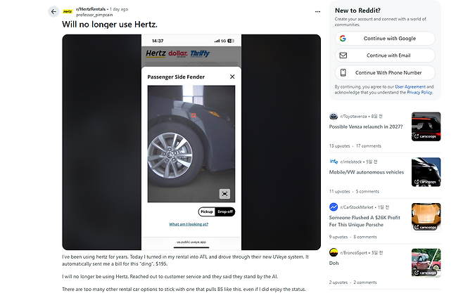 해당 이용자는 “수년간 허츠를 이용해 왔다”라고 밝히며, 이제는 다른 렌터카 회사를 이용하겠다고 말했다. 그는 “앞으로는 허츠를 이용하지 않을 것이다. 고객센터에 연락했더니 ‘AI 결과를 신뢰한다’라는 답변만 돌아왔다. 이렇게 말도 안 되는 방식으로 요금을 부과하는 회사를 계속 이용할 이유가 없다”라고 비판했다.