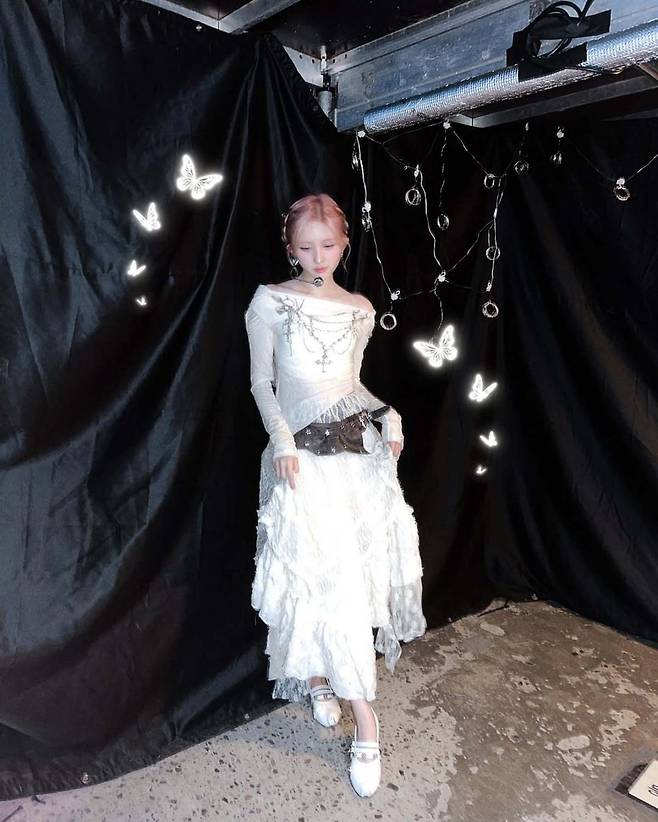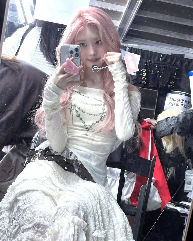 백스테이지에서는 광택감이 도는 실버 코르셋 드레스와 하트 펜던트 목걸이 등으로 또 다른 분위기를 보여줬다. 블랙 가죽 소재의 크롭탑과 롱 글러브, 체인과 스터드 장식의 강렬한 무드도 눈길을 끌었다. 각 의상마다 색감과 소재가 조화를 이루며, 핑크 헤어와 어우러져 독특한 무드를 완성했다.