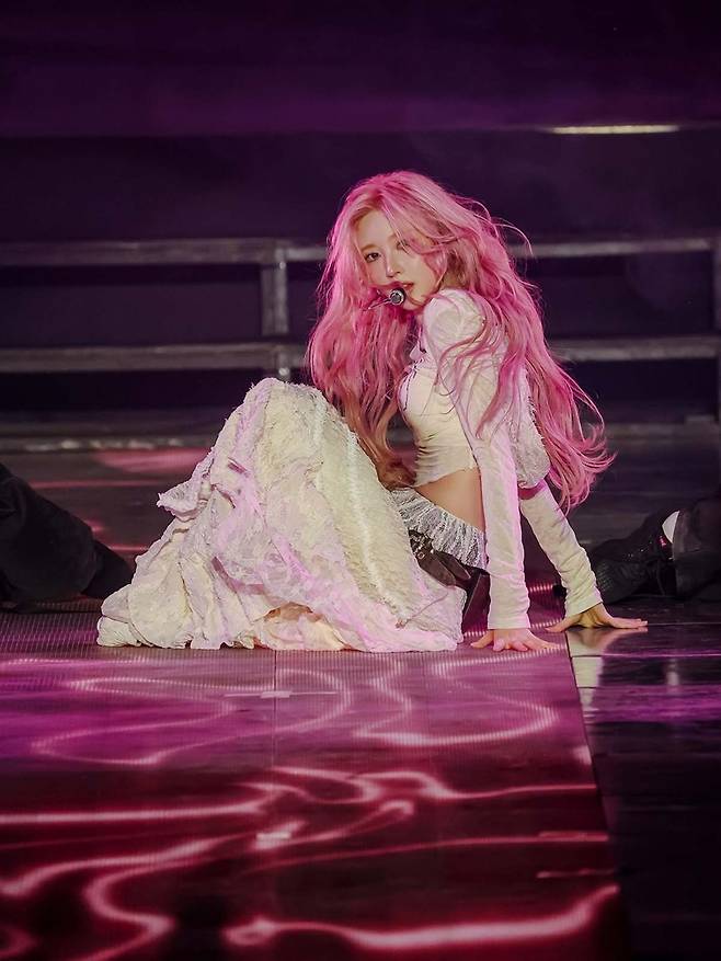 IVE 가을이 무대와 백스테이지에서 선보인 핑크 헤어스타일과 다양한 패션이 화제를 모으고 있다.