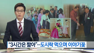 메뉴는 삼색찰떡, 오이소박이, 닭고기편구이, 낙지후추구이, 오이절임, 삼색나물, 숭어완자튀김, 돼지고기 빵가루튀김, 금강산 송이버섯 볶음, 소고기 볶음밥, 사과, 가시오갈피차, 금강산 샘물, 사이다