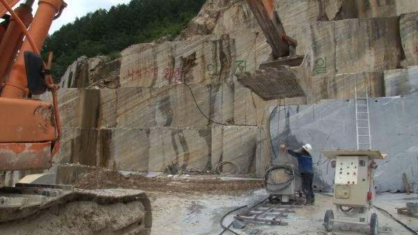 정선 대리석 채석은 전통적인 발파 방식이 아닌, 고성능 다이아몬드가 박힌 얇은 와이어로 돌을 절단하는 정밀한 방식을 따른다.