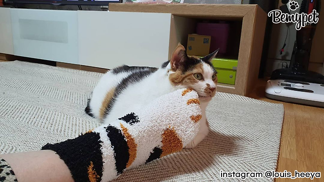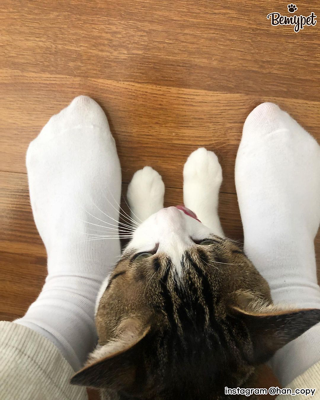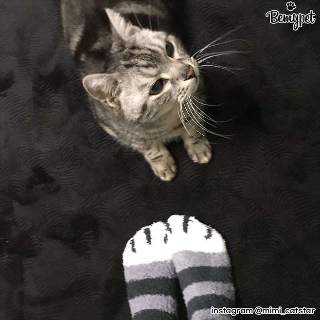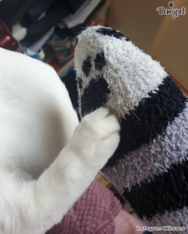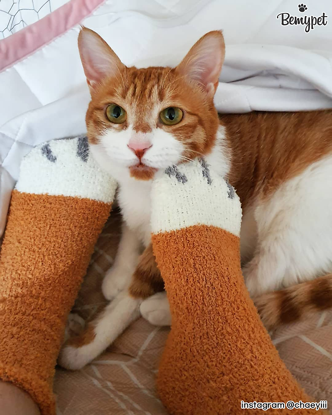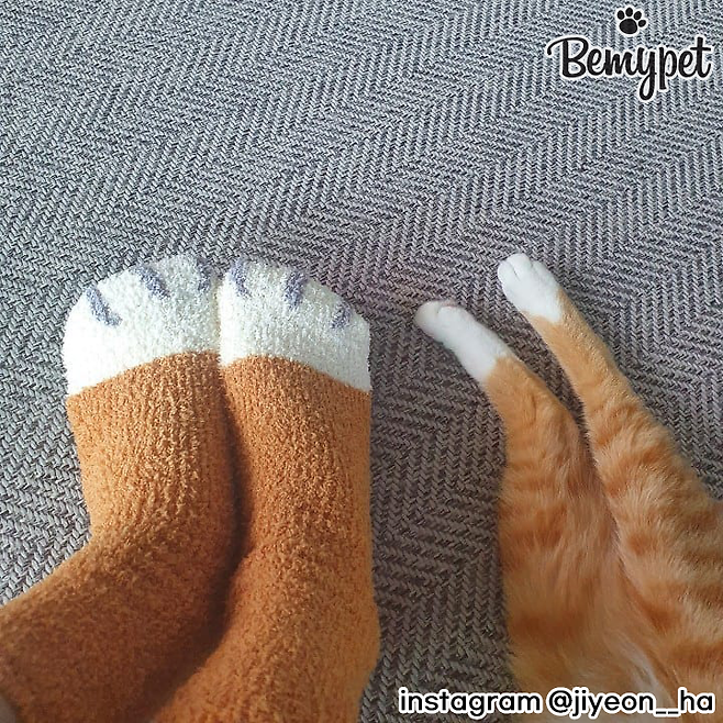 고양이와 함께 사진 찍을 때 귀여운 고양이 양말을 신고 찍는 건 어떨까요? 고양이 발처럼 보이기도 하고, 따뜻해서 수족냉증으로 항상 손발이 찬 집사에게 좋답니다.