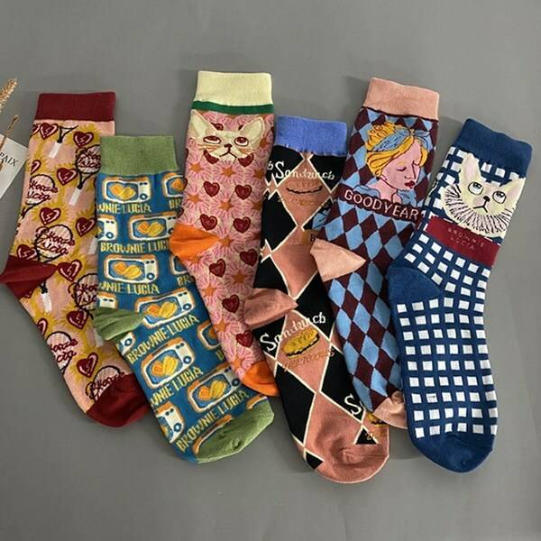 워더미 여성 비비드 캣츠 하트 일러스트 중목 양말 세트 CHW358