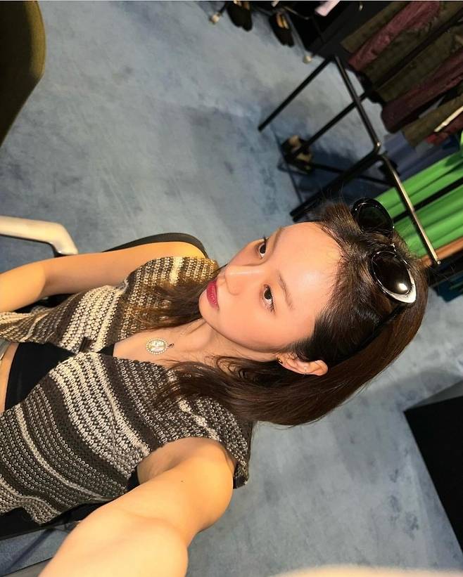혜리는 블랙 크롭 톱 위에 줄무늬 니트 조끼 착용해 스타일리시한 매력을 발산했습니다.