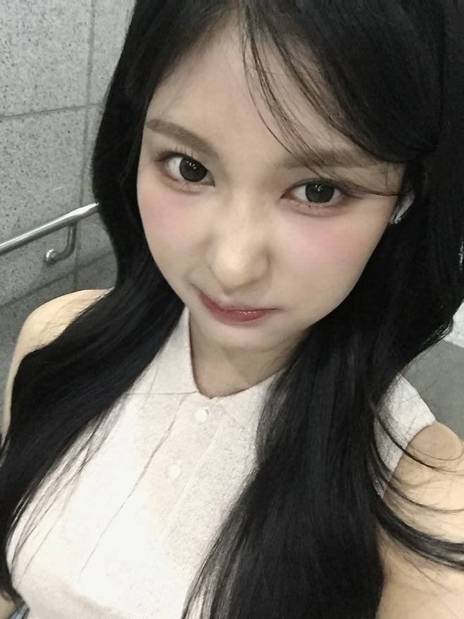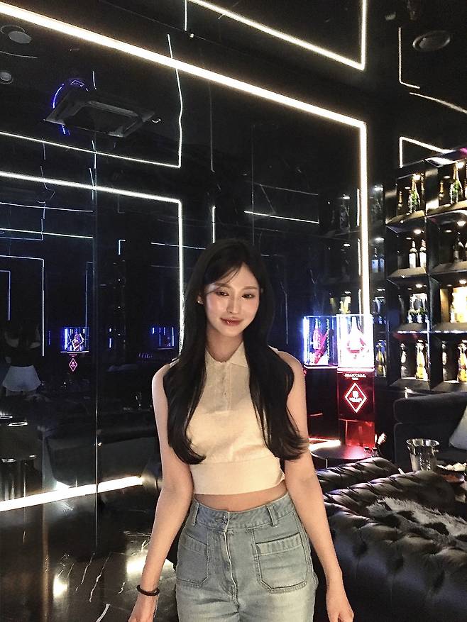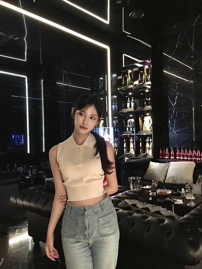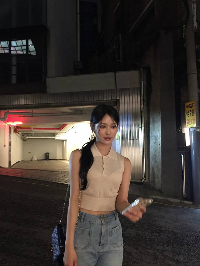 카라가 달린 베이지 민소매 니트탑과 연청 데님의 조합.