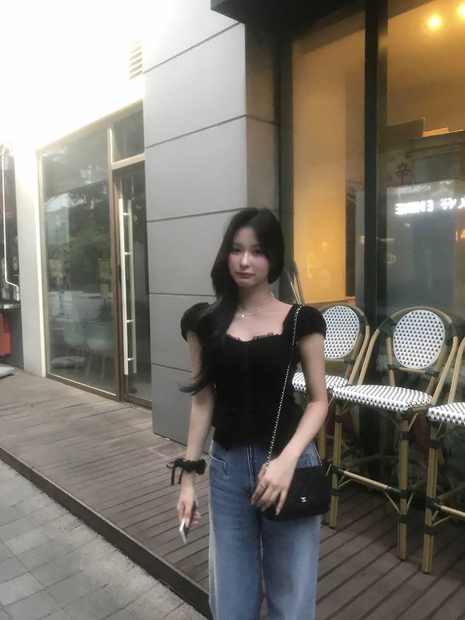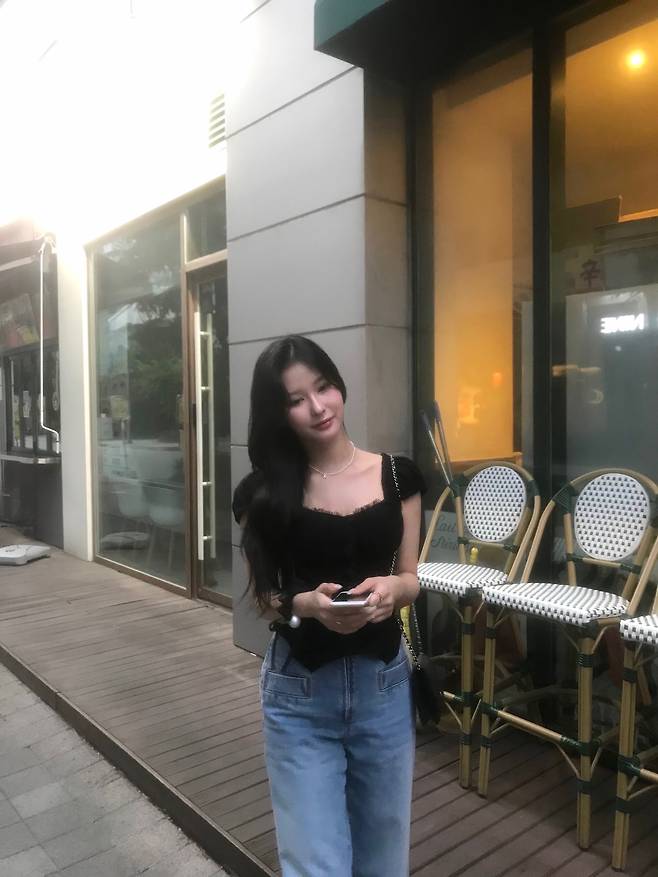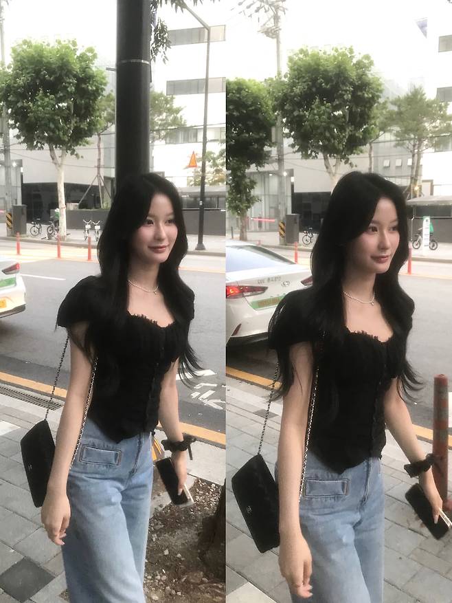퍼프 소매가 들어간 블랙 레이스 블라우스에 하이웨스트 연청 일자핏 데님을 매치한 코디.