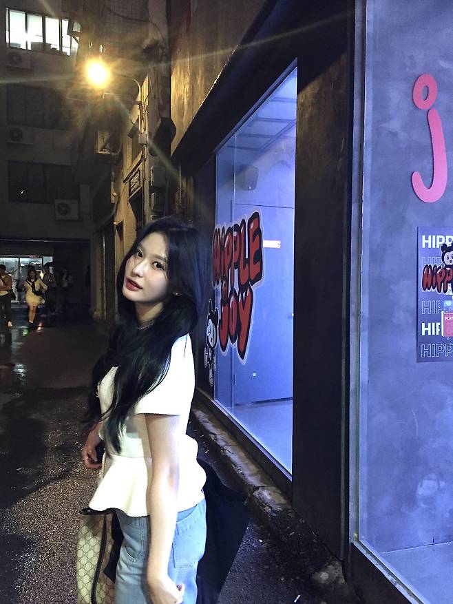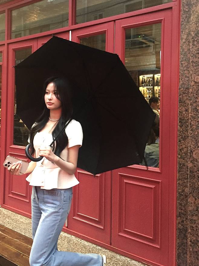 허리를 잘록하게 잡아주는 실루엣과 깔끔한 연청 데님의 조합이 단정하면서도 사랑스럽습니다.