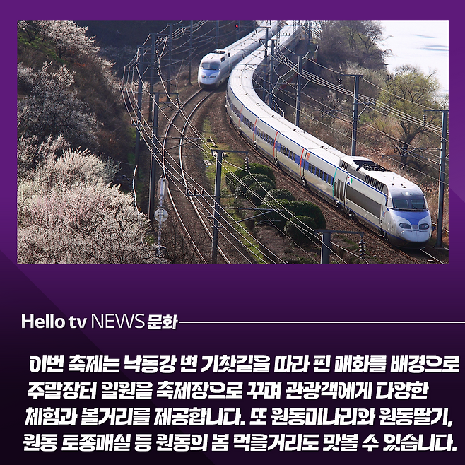 이번 축제는 낙동강 변 기찻길을 따라 핀 매화를 배경으로 주말장터 일원을 축제장으로 꾸며 관광객에게 다양한 체험과 볼거리를 제공합니다.