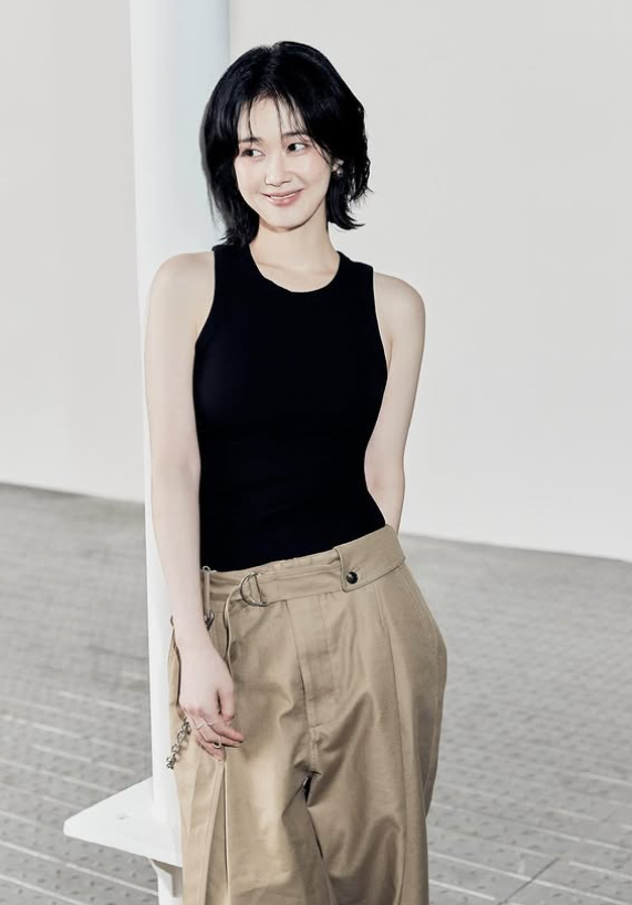 장나라 님의 느낌 좋은(느좋) 화보 패션을 모아봤어요. 블랙 나시티에 와이드 한 베이지 팬츠로 캐주얼한 룩을 완성했죠.