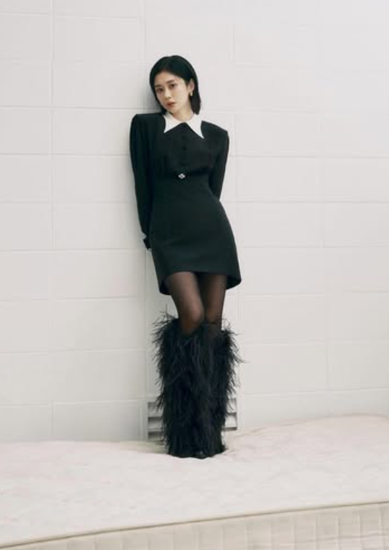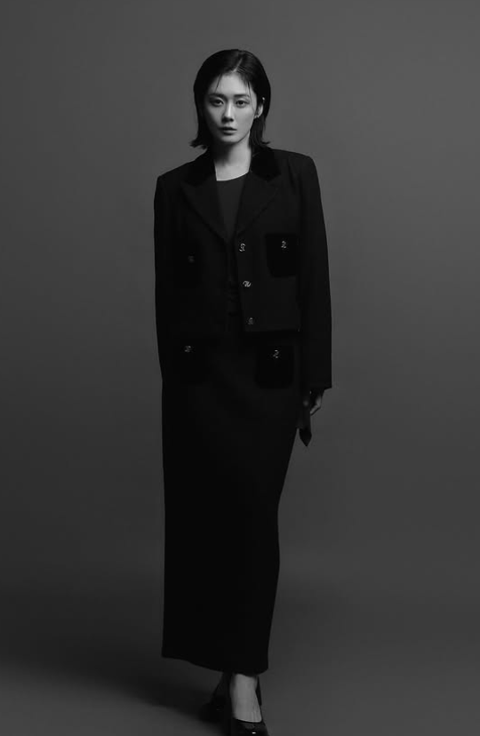 크롭 한 기장의 블랙 재킷에 슬림한 라인으로 떨어지는 롱스커트로 고풍스러운 분위기를 풍기기도 했죠.