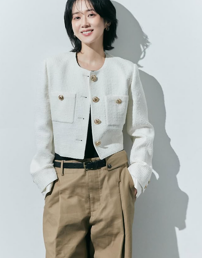 클래식한 화이트 트위드 자켓에 베이지팬츠로 캐주얼하면서 멋스러운 룩을 뽐내기도 했는데요! 장나라 님은 바지 주머니에 손을 넣어 포즈를 취해 더욱 세련된 분위기를 연출했어요.