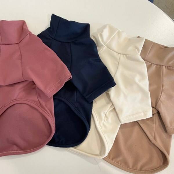 겨울용 티셔츠로 입히기 좋은 도톰한 티셔츠입니다. 무지 티셔츠로 어디에나 잘 어울리고, 터틀넥 디자인이라 목까지 감싸주어 따뜻해요. 신축성이 좋아 강아지 활동을 크게 방해하지 않아요. 또한, 색상도 총 13가지로 매우 다양합니다.