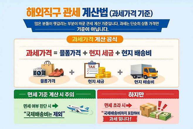 관세는 단순히 물건값에만 붙는 것이 아닙니다. 현지 세금(Sales Tax)과 현지 배송비가 포함된 '과세가격'이 기준입니다.