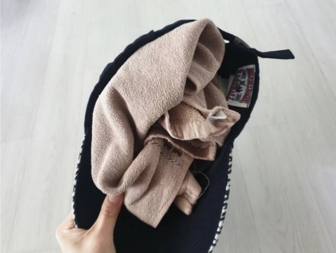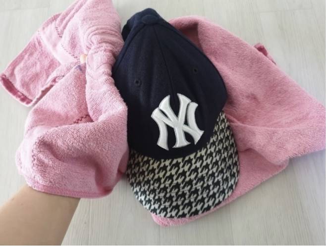 어느 정도 물기가 빠졌다면 다른 마른 수건 하나는 동그랗게 만들어서 모자 안쪽에 넣어주세요