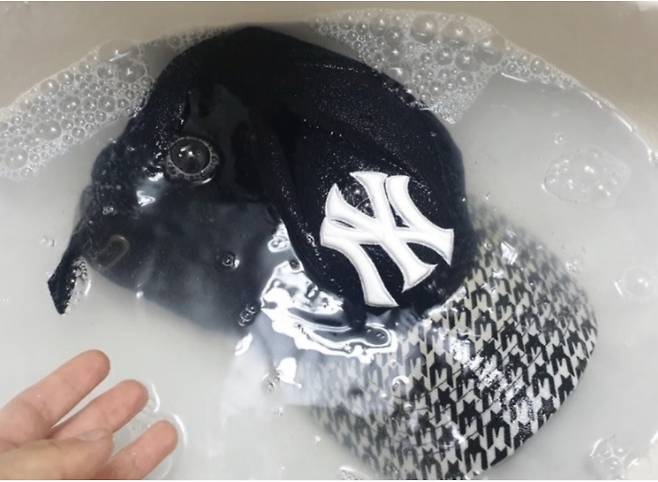 색이 진한 모자일수록 색이 빠질 수 있으니 너무 오래 담가두지 마세요~