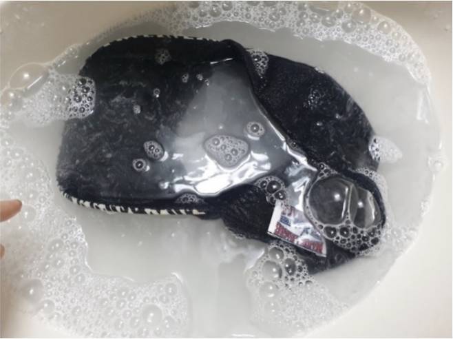 모자를 샴푸물에 5분 정도 담가주세요