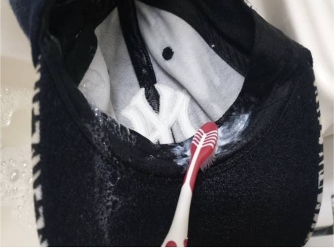 모자 윗부분이 망가지지 않게 힘을 주지 않고 약하게 조물조물 씻어줍니다