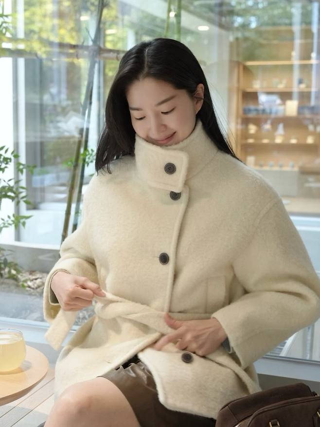 살짝 하이넥으로 올라오는 단추 디테일이 포인트를 주며, 단정하면서도 세련된 실루엣을 완성했죠.