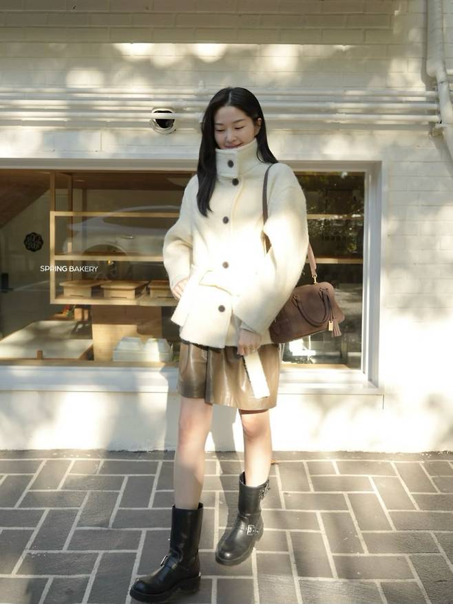 코트의 부드러움과 부츠의 강한 실루엣이 대비되면서, 클래식과 모던함이 공존하는 스타일이 완성됩니다.
