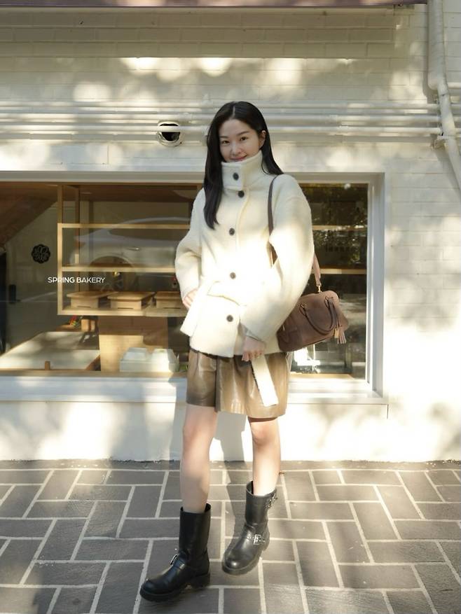 여기에 가죽 소재의 브라운 쇼츠를 더해 겨울 특유의 묵직함 속에서도 산뜻한 포인트를 만들어냈어요.