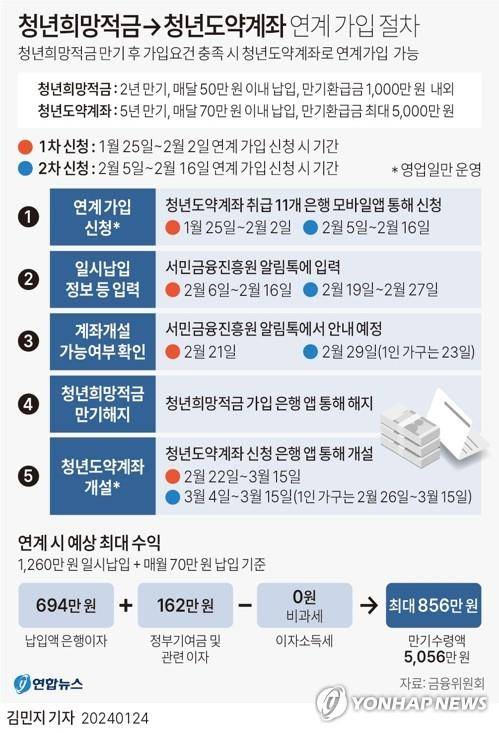 금융위원회가 시뮬레이션 한 결과, 청년희망적금 만기자가 청년도약계좌로 일시 납부(일시 납입금 1천260만원, 월 설정금액 70만원, 금리 6% 가정) 시 만기에 얻을 수 있는 수익은 최대 약 856만원으로, 일반 적금 상품(평균금리 3.54% 가정)의 기대 수익 약 320만원 대비 2.67배 높다.